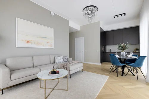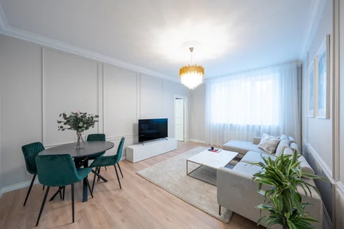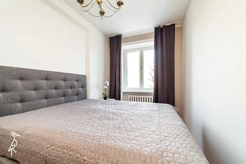 The apartment has a spacious layout and is bright and sunny. Large windows add to the spaciousness. The interior is characterised by a minimalist Scandinavian style that values functional design, quality materials and clean lines.